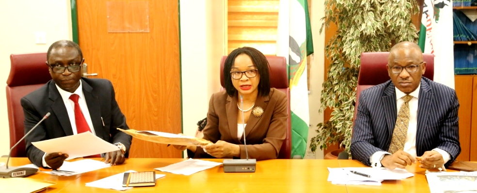 L-R: Yunana Malo, Director, Post-Privatisation Monitoring at the Bureau of Public Enterprises (BPE); Imeh Okon, Senior Special Assistant (SSA) to the President on Infrastructure, who represented the Chairman of the Technical Committee of the National Council on Privatisation; and Alex A. Okoh, Director General, BPE at the financial bids opening for five subsidiaries of Nigerian Mining Corporation and technical consultancy for power sector monitoring which held in BPE on Tuesday, October 24, 2017.