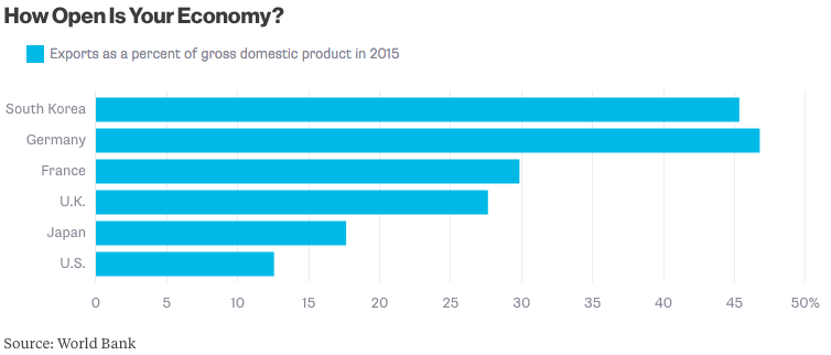 So exporting more might help even a high-productivity country such as the U.S. The same goes for Japan, which despite its legendary export prowess is actually a fairly closed economy.