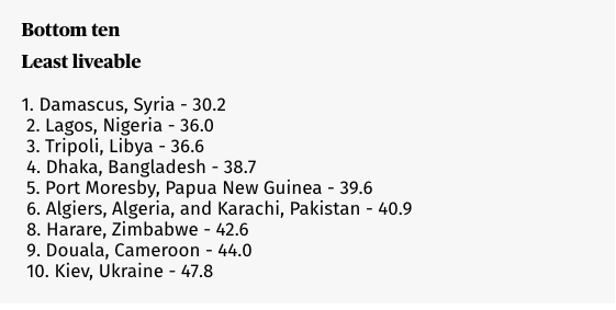 On the other hand, mid-sized cities in wealthy countries tend to do well in the rankings, since lower population density means infrastructure that is under less strain, often making for better quality of life.